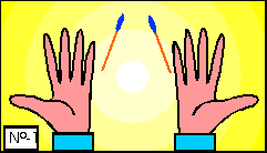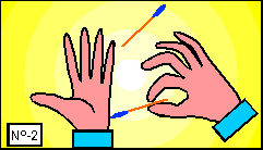 Deposita dos cerillas corrientes encima de la mesa y muestra tambien tus dos manos claramente vacias ( fig. Nº 1 ) mientras dices -dos cerillas y dos manos....-. Coje una de las cerillas con la mano derecha ( fig. Nº 2 ) y finge depositarla en la otra mano que se cierra inmediatamente ( en realidad la retienes en tu mano sujeta entre los dedos indice y mayor derechos , practica este movimiento hasta que pase desapercibido ) .