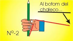 Sujeta un estremo del hilo a un boton de tu chaleco ( si es que llevas ) o en su defecto al boton del pantalon . En el otro estremo esta pegada una bolita del adesivo tipo masilla .Entrega el lapiz a examinar ( tambien puede ser prestado ) y cuando te lo devuelvan pega disiluladamente el trozo de masilla en su base , de esta forma el lapiz estara unido al hilo .Mete ahora el lapiz en tu puņo izquierdo igual que en la figura Nš2 .
