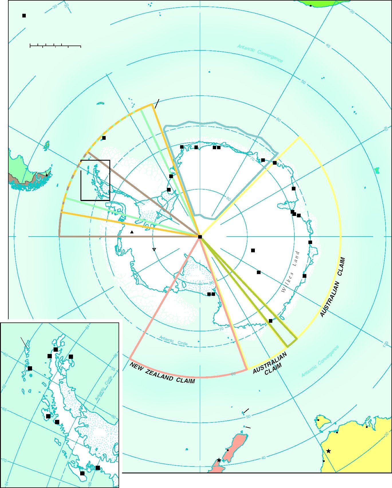 Points: 90 E 0 90 W 180 Bouvet Island South Georgia and the (administered by U.K., Falkland Islands (Islas Malvinas) (administered by U.K., McDonald Islands South Sandwich Islands Heard Island and French Southern and Antarctic Lands claimed by ARGENTINA) claimed by ARGENTINA) Drake Passage Weddell Sea Amery Ice Shelf Ross Ice Shelf Ronne Ice Shelf average minimum extent of sea ice Ross Sea Bellingshausen Sea Amundsen Sea O c e a n O c e a n Southern Ocean Southern Ocean Southern Ocean S o u t h P a c i f i c O c e a n S o u t h P a c i f i c I n d i a n O c e a n S o u t h A t l a n t i c Ice Shelf Larsen Ice Shelf Shackleton Scotia Sea CHILE ARGENTINA SOUTH AFRICA (AUSTRALIA) (FRANCE) (SOUTH AFRICA) (RUSSIA) (JAPAN) (AUSTRALIA) (SOUTH AFRICA) (RUSSIA) (AUSTRALIA) (RUSSIA) (RUSSIA) (FRANCE) (AUSTRALIA) (AUSTRALIA) (NEW ZEALAND) (NEW ZEALAND) (CHINA) (RUSSIA) (FRANCE AND ITALY) A U S T R A L I A NEW ZEALAND (NEW ZEALAND) (NEW ZEALAND) (U.S.) (N.Z.) (ARGENTINA) (ARGENTINA) (U.S.) (GERMANY) (INDIA) (NORWAY) ANTARCTIC REGION FRENCH CLAIM Macquarie Island Mirnyy Dumont d'Urville Scott Island Year-round research station CHATHAM ISLANDS BALLENY ISLANDS PRINCE EDWARD ISLANDS ĪLES CROZET ĪLES KERGUELEN CLAIM CHILEAN a station on King George Island. Peter I Island Argentina, Brazil, Chile, China, Poland, Russia, South Korea, Uruguay each have 803121AI (R02207) 3-05 1000 Kilometers 1000 Miles 500 500 0 0 Azimuthal Equal-Area Projection San Martin Rothera Marambio Arturo Prat Palmer Peninsula Antarctic NORWEGIAN CLAIM Tasmania Mawson Davis Casey McMurdo Amundsen-Scott Belgrano II Orcadas CLAIM BRITISH enlargement South Pole 2800 m. Scale 1:68,000,000 Canberra Wellington Hobart Adelaide Sydney SOUTH ORKNEY ISLANDS SHETLAND Ushuaia SOUTH ISLANDS Christchurch Melbourne Campbell Island SNARES ISLANDS AUCKLAND ISLANDS ARGENTINE CLAIM undefined limit Port Elizabeth North Island South Island Vernadsky O'Higgins Bernardo Scott Halley(U.K.) Neumayer Maitri SANAE IV Molodezhnaya Zhong Shan Progress Vostok Concordia Syowa Land Land Land Enderby Land Land Mac. Robertson Queen Maud Land Marie Byrd Ellsworth Vinson Massif Bentley Subglacial Trench Palmer Victoria Land Land Graham Novolazarevskaya Esperanza area of (highest point in Antarctica, 4897 m) (lowest point in Antarctica, -2540 m) Twenty-one of 28 Antarctic consultative nations have made no claims to Antarctic territory (although Russia and the United States have reserved the right to do so) and they do not recognize the claims of the other nations. (ARGENTINA) (ARGENTINA) (CHILE) (CHILE) (U.S.) (ARGENTINA) (U.K.) (UKRAINE) |