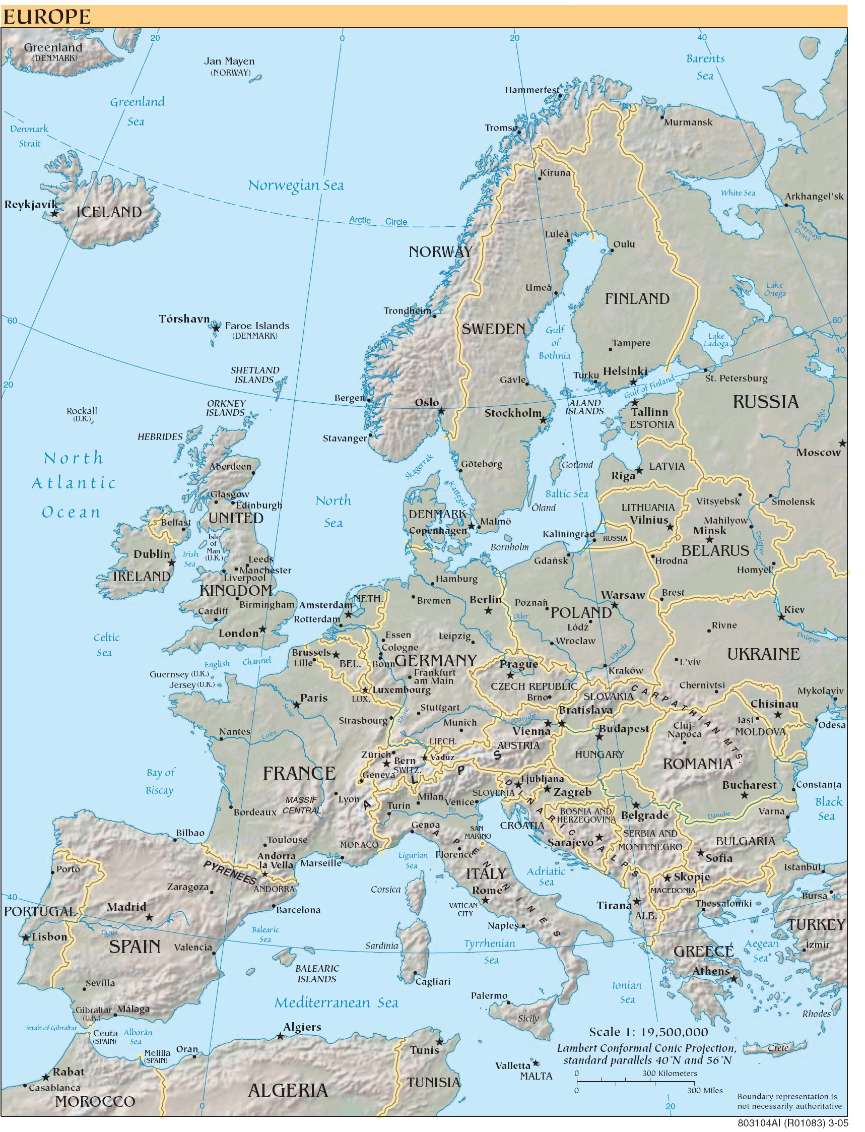 20 20 0 40 60 40 40 20 0 40 20 60 Adriatic Mediterranean Sea Sea Sea Sea Tyrrhenian Ionian Aegean Sea Lake Lake Sea Greenland Biscay Barents Ladoga Onega White Sea Irish of Gulf Bothnia Po Sea Black Oder Sea Balearic Baltic Sea North Sea Tagus Ligurian Sea Sea A t l a n t i c N o r t h O c e a n Norwegian Sea Bay of Celtic Sea Strait Denmark Sea Strait of Gibraltar Sea Alborán SPAIN RUSSIA ALB. SAN TUNISIA ALGERIA MOROCCO PORTUGAL ITALY CITY MALTA VATICAN MARINO MACEDONIA ROMANIA AUSTRIA SWITZ. SLOVENIA HUNGARY SERBIA AND MONTENEGRO BOSNIA AND HERZEGOVINA SLOVAKIA CZECH REPUBLIC RUSSIA LITHUANIA UNITED KINGDOM IRELAND DENMARK ICELAND LATVIA TURKEY (DENMARK) (NORWAY) (DENMARK) (U.K.) (U.K.) Guernsey Jersey POLAND BELARUS UKRAINE GERMANY SWEDEN FINLAND NORWAY (SPAIN) Gibraltar LIECH. MONACO ANDORRA LUX. MOLDOVA ESTONIA BEL. NETH. CROATIA (U.K.) Isle of Man (U.K.) Melilla (SPAIN) Ceuta BULGARIA GREECE (U.K.) FRANCE Essen Leipzig Bremen Hamburg Greenland Frankfurt Cologne Bonn Glasgow Birmingham Rotterdam Wroclaw Poznan St. Petersburg Turin Istanbul Izmir Liverpool Stuttgart Munich L'viv Lódz Kraków Arkhangel'sk Belfast Leeds Edinburgh Cardiff Marseille Bordeaux Lyon Bilbao Málaga Valencia Zaragoza Sevilla Oran Bursa Kaliningrad Gdansk Bergen Göteborg Trondheim Malmö Tromsř Murmansk Oulu Napoca Cluj- Constanta Iasi Varna Homyel' Brno Zürich Vitsyebsk Mahilyow Hrodna Brest Odesa Milan Thessaloníki Helsinki Oslo Stockholm Tallinn Moscow Vilnius Copenhagen Minsk Dublin Warsaw Berlin Amsterdam Kiev London Brussels Prague Luxembourg Paris Chisinau Bratislava Budapest Vienna Vaduz Bucharest Zagreb Belgrade Sarajevo Sofia Rome Madrid Lisbon Valletta Rabat Reykjavík Riga Bern Casablanca Tórshavn ´ ´ ´ am Main Lille Nantes Toulouse Andorra la Vella Manchester Ljubljana Skopje Mykolayiv Rivne Chernivtsi Aberdeen Stavanger Luleĺ Umeĺ Venice Florence Genoa Geneva Strasbourg Gävle Turku Tampere Hammerfest Kiruna Smolensk Tirana Cagliari Naples Palermo Algiers Tunis Barcelona Athens Porto ˇ ¸ ¸ Crete Sicily Sardinia Rhodes ISLANDS BALEARIC Corsica Öland Bornholm Gotland ALAND ISLANDS Rockall Jan Mayen Faroe Islands SHETLAND ISLANDS ORKNEY ISLANDS HEBRIDES 803104AI (R01083) 3-05 EUROPE 0 Scale 1: 19,500,000 Lambert Conformal Conic Projection, standard parallels 40°N and 56°N 300 Kilometers 300 Miles 0 MASSIF CENTRAL Boundary representation is not necessarily authoritative.