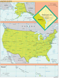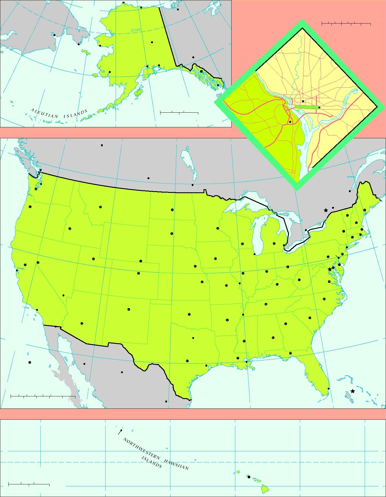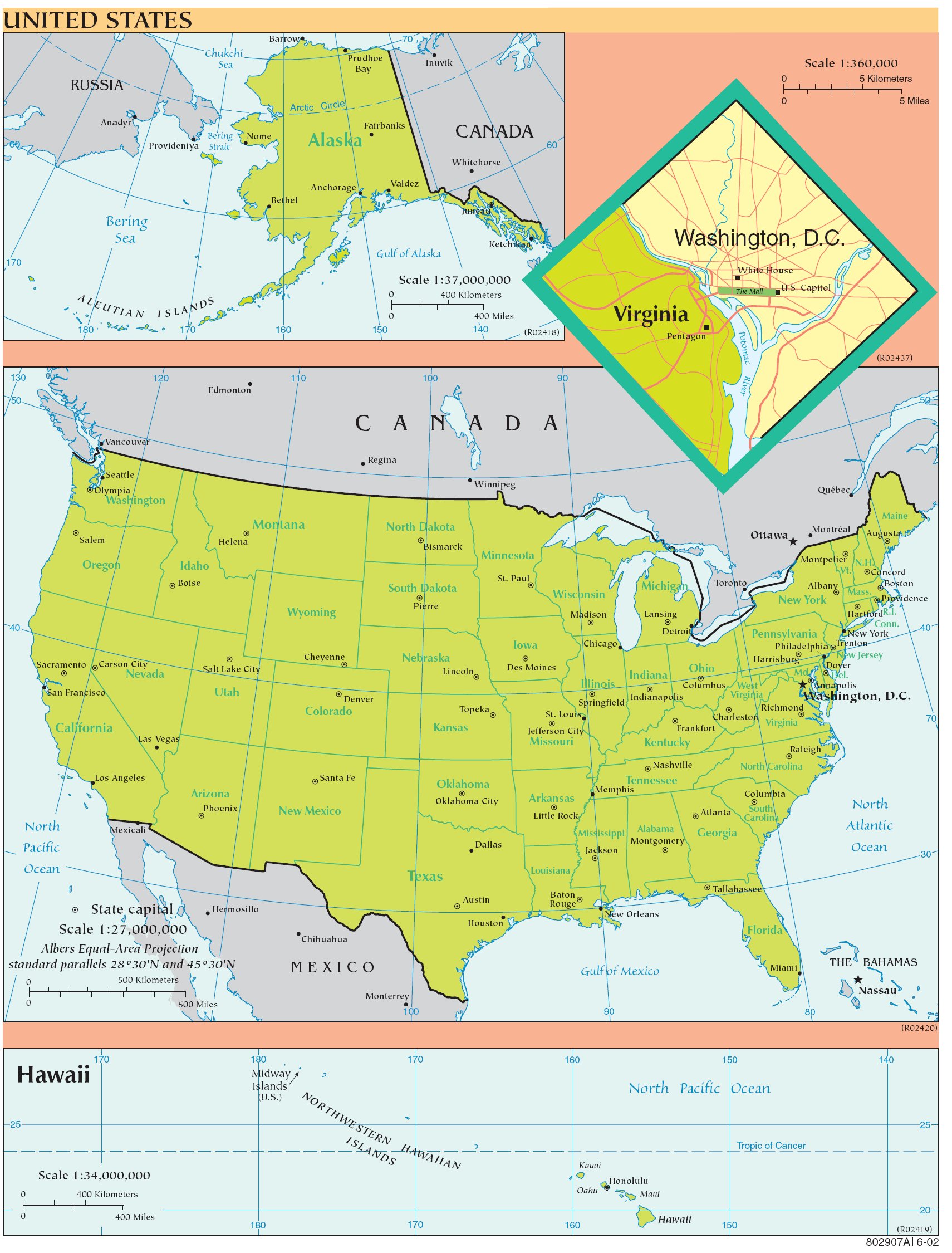 Points: Arctic 60 60 140 150 160 170 180 170 70 Tropic of Cancer 20 25 140 150 160 170 180 170 180 170 25 160 150 100 90 80 30 70 40 90 100 50 110 50 40 130 120 Washington Oregon Arizona New Mexico Texas Oklahoma Kansas Colorado Utah Nevada California Idaho Montana North Dakota South Dakota Nebraska Minnesota Iowa Missouri Arkansas Mississippi Alabama Louisiana Florida Georgia Tennessee Wisconsin Illinois Indiana Ohio Michigan Kentucky New Jersey New York Conn. R.I. Mass. N.H. Maine Wyoming Pennsylvania Virginia Virginia West Del. Md. Vt. Carolina North Carolina South Alaska Ocean North Atlantic Gulf of Mexico North Ocean Pacific Bering Sea Sea Bering Strait Gulf of Alaska North Pacific Ocean Chukchi RUSSIA CANADA C A N A D A M E X I C O THE BAHAMAS (U.S.) Edmonton Regina Olympia Boise Helena Salt Lake City Pierre Cheyenne Winnipeg Lincoln St. Paul Des Moines Madison Lansing Harrisburg Toronto Trenton Providence Hartford Concord Albany Montpelier Augusta Carson City Mexicali Phoenix Santa Fe Denver Oklahoma City Austin Jefferson City Little Rock Jackson SpringfieldIndianapolis Nashville Montgomery Frankfort Columbus Charleston Tallahassee Columbia Atlanta Hermosillo Chihuahua Monterrey Richmond Raleigh Dover Annapolis Boston 0 400 Kilometers 0 400 Miles Hawaii Honolulu Midway Islands Nassau Ottawa Washington, D.C. Québec Montréal Whitehorse Ketchikan Juneau Valdez Fairbanks Anchorage Inuvik Bay Prudhoe Barrow Nome Bethel Provideniya Anadyr' Topeka New York Chicago Miami Philadelphia Detroit Houston Dallas Seattle Vancouver Las Vegas Los Angeles San Francisco Sacramento Memphis New Orleans St. Louis Baton Rouge Salem Bismarck Scale 1:37,000,000 Oahu Kauai Hawaii Maui 0 400 Kilometers 0 400 Miles Scale 1:34,000,000 500 Kilometers 500 Miles 0 0 standard parallels 28º30'N and 45º30'N Scale 1:27,000,000 Albers Equal-Area Projection State capital 802907AI 6-02 (R02419) Scale 1:360,000 5 Kilometers 5 Miles 0 0 (R02437) UNITED STATES (R02420) (R02418) White House U.S. Capitol The Mall Washington, D.C. Virginia Pentagon |