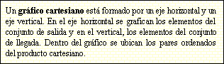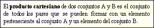 Llamaremos producto cartesiano de dos conjuntos que simbolizaremos como AXB a todos los pares de elementos ordenados que podamos formar tomando como primer elemento un elemento del conjunto A y como segundo un elemento del conjunto B