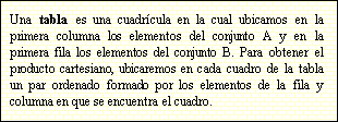 Si tenemos dos conjuntos A y B, y tratamos de armar todos los pares posibles  formados por un elemento del conjunto A y un elemento del conjunto B, obtendremos  el producto cartesiano de los dos conjuntos. Se escribe: