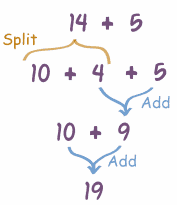 las decenas: 10 + 9 = 19