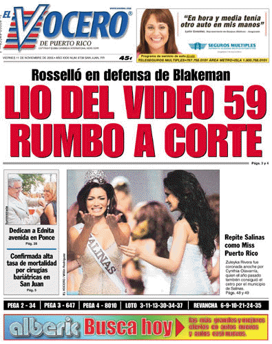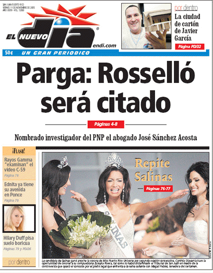 La ya esperada victoria de la salinense Zuleyka Rivera Mendoza como Miss Puerto Rico Universe 2006 fue ensombrecida con el ambiente de expectación que prevaleció anoche en el Muelle Panamericano de San Juan. Fue Zuleyka la reina de la noche, pero las estrellas estelares de esta polémica historia siguieron siendo Magali Febles y Cynthia Olavarría, que tras el pleito legal se vieron las caras por vez primera. El público se mantuvo en vilo desde el pasado septiembre cuando Cynthia Olavarría demandó a Magali Febles por incumplimiento de contratos y daños. Anoche, aplaudían a la nueva reina, pero sus ojos estaban en cada movimiento de Cynthia Olavarría, quien finalmente logró coronar a su sucesora –acompañada de la Miss Universe, Natalie Glebova-, mas no pudo desfilar. No obstante, recibió el respaldo del público con una fuerte ovación. Cynthia, tras entregar la corona, abrazó a la nueva soberana y le deseó mucho éxito, así como su apoyo. Sin quebrantar los pronósticos, la estudiante de comunicaciones Zuleyka Rivera Mendoza celebró anoche su victoria como Miss Puerto Rico Universe 2006, reteniendo para el pueblo de Salinas el cetro de reina. El predecible resultado lo esperó mientras agarraba fuertemente la mano de la primera finalista, Yauco (Lorenia Delgado). Ambas candidatas se habían ubicado como favoritas desde el inicio de la competencia. Ponce (Marilyn Bartolomei) resultó segunda finalista, mientras que Río Piedras (Tanya D. Huntley), tercera. Este cuadro se completó con Lajas (Lizmary Nazario) y Dorado (Vanessa Figueroa), como cuarta y quinta finalista, respectivamente. La noche arrancó con el baile de apertura del coreógrafo Scott Grossman y las candidatas con llamativos conjuntos del diseñador puertorriqueño Carlos Alberto. Apenas un minuto antes del inicio de la desafortunada transmisión televisiva, hizo su entrada al recinto la reina saliente Cynthia Olavarría, lo que levantó a la audiencia de sus asientos provocando el desespero del coreógrafo Scott Grossman, ya que el frente del escenario estaba vacío. La beldad y sus acompañantes ocuparon unos asientos en primera fila, tras conseguir boletos de unos auspiciadores que no acudieron. Seguido apareció en escena la animadora, la ex Miss Universe Deborah Carthy Deu, quien introdujo a sus compañeras de labores, las también ex reinas Brenda Liz López y Zoribel Fonalledas, quienes protagonizaron el primer "huevo" de la noche al quedarse calladas frente a las cámaras. También falló el sonido, por lo que fueron abruptamente a una pausa comercial. Sin saber para qué cámara mirar y acentuando los problemas de coordinación en la producción, Deborah Carthy Deu llamó al frente al cuadro de las 12 semifinalistas, más una candidata seleccionada a través de mensajes de texto de los celulares. Este cuadro de honor fue completado por las delegadas de Añasco (Sheila García), San Juan (Jessenia Tirado), Moca (Yeidy Bosques), Utuado (Miriany Cruz), Arecibo (Nicole Fernández), Trujillo Alto (Daphne Benet) y Juana Díaz (Alba Ortiz). Los errores volvieron a florecer con unas perdidas Brenda Liz y Zoribel, que otra vez fueron víctimas de las fallas de dirección y sonido, aparte de su poca soltura y fluidez ante las cámaras. El programa continuó con la presentación de Miss Universe 2005, Natalie Glebova, quien dijo en un masticado español: "Buenas noches, Puerto Rico". Una vez presentado el panel de jurados –del que se excusó la cantante Yolandita Monge–, las semifinalistas iniciaron la competencia desde cero con el desfile en traje de baño. Aquí se destacaron las jóvenes de Salinas, Dorado, Yauco, Ponce y Río Piedras. Los gritos del público para sus candidatas se volcaron hacia Chayanne cuando entró al escenario a interpretar "Te echo de menos" y "No te preocupes por mí". Las semifinalistas entraron una vez más al escenario para el desfile en traje de gala –en el que predominó el color blanco–, momento que precedió el anuncio de las cinco finalistas. A éstas se unió, una vez más, la electa por el pueblo, la lajeña Lizmarie Nazario. En la sesión de preguntas individuales, sobrecargadas algunas con el tema de la paz (tan común en este tipo de evento), destacó Zuleyka Rivera. El dúo Wisin y Yandel, que marcó el debut del género reggaetón en este certamen, presenó el tema "Llame pa' verte" mezclado con su éxito "Rakata". Su actuación, algo deslucida por los recurrentes problemas de sonido, dio paso a elección de la nueva reina. Fuente Primera Hora |
