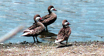 Sus alas son marrón oscuro y pueden tener unos bordes color dorado. La cabeza de esta ave es ovalada y alargada hacia atrás, sus patas son negruzcas y la cola es de color chocolate, con un toque de blanco en la punta. El pico es color verde grisaceo con un triángulo rojo o anaranjado en la base de la mandibula. Los juveniles son bastantes parecidos a los adultos, con la diferencia de que sus colores son menos brillantes. Habitat- Los patos quijada colorada viven en todo tipo de hmuedal, entre ellos las charcas, las lagunas y los manglares Es posible encontrarles en lugares bajos, que queden inundados después de fuertes lluvias. Información general- El pato quijada colorada es un especie endémica del Caribe. Anida en la Antillas Mayores y Menores y en el norte de America del Sur. Es residente en Puerto Rico durante los meses de febrero a mayo, aunque pueden encontrarse nidos con huevos en otras épocas del año Para formar su nido, el pato escarba una pequeña depresión en la tierra que luego cubre con hojas o yerbas. El lugar de anidaje se encuentra a una distancia corta. de la orilla, cerca de pantanos, tierras anegadas o entre las raíces de los mangles. El período de anidaje puede ocurrir en cualquier momento del año, tomando en cuenta factores como la lluvia y el acceso a los alimentos Las hembras es la encargada de incubar los 5 a 12 huevos color crema que pone en cada puesta. Generalmente, los polluelos comienzan a practicar el vuelo entre los 35 y 50 días de nacidos. La dieta de Anas consiste en pequeños animales invertebrados, semillas, algas y cualquier otro tipo de materia vegetal. Usualmente, se encuentran acompañados de su pareja o en grupos de su misma especie que pueden llegar a los 50 individuos. Se le llama el pato de la orilla porque suele estar en el agua y camiando por sus orillas. Esta espeice ha sido amenazada por la caza furtiva y por la introducción de animales exóticos, como la mangosta, que tiende a alimentarse de huevos. Otro factor que ha costribuido a la merma del pato es la desaparición de su habitat gracias a la pobre planificación de los complejos de vivienda en la Isla. Sin embargo, pueden avistarse poblaciones considerables en la isla municipio de Culebra y Vieques en donde se espera aumente la población en los terrenos que pertencieron a la marina estadounidense. Primera Hora-2-6-06 |