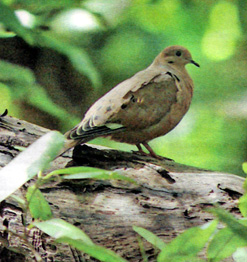 Los adultos de esta especie tienen una pigmentación general de color gris chocolate. con un leve tinte amarillo rojizo. La parte posterior del pescuezo es color púrpura claro. Los machos se distinguen por unas manchas que tienen a los lados del pescuezo, de un tono azul , que parecen orejas, por lo que la palabra "aurita" forma parte del nombre científico de la especie. Las plumas centrales del rabo son color chocolate, mientras que las externas son gris, todas atravesadas por una banda negra.plumaje de la espalda puede tener puntos negros o líneas blancas. Por otra parte, los lados de la cabeza y su garganta muestran un pigmento canela grisáceo. La barba de la tórtola es blancuzca y el pecho y el abdomen son vino oscuro. Su pico es negro, sus patas son rojizas y tiene un tamaño aproximado de 10 pulgadas de largo. Los juveniles se esta especie son más chocolate que los adultos. Habitat: La tórtola prefiere las tierras cultivadas, los cafetales y las malezas en las regiones secas de Puerto Rico .Sin embargo, pueden avistarse individuos cerca de la costa cuando están en busqueda de agua. Además , es un ave común en los paisajes urbanos de la Isla La primera parte del nombre científico de la especie se deriva del nombre de la hija del científico que la clasificó por primera vez. La tórtola cardosantera es muy abundante en la isla y es una de las aves de caza mejor reconocidas. En los lugares donde es bastante perseguida por los cazadores su temperamente, generalmente manso, puede ser arísco. Su dieta consiste en semillas, frutas y en ocasiones, hojas de plantas. Es común verla en el suelo en busca de alimentos, pero al momento de alzar el vuelo, se distingue porque es rápido y sostenido. Zenaida aurita- construye su nido con frágiles ramas y plantas secas, colocadas en arbustos o árboles a poca elevación del suelo. Anidan en Puerto Rico entre abril y agosto, cuando ponen dos huevos blancos y puntiagudos que miden alrededor de una pulgada. Otros lugares de anidaje son las Islas Bahamas, así como las Antillas Mayores y las Menores. Tomado de Primera Hora-3-27-06 |