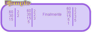 un ejemplo: Procedemos a descomponer al número 60 60 es divisible por varios números primos (o factores primos): 2, 3, 5 Tomemos el factor primo 2 para usarlo como divisor de 60. |