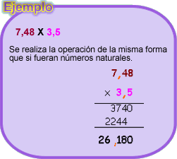 Multiplicación de números decimales Los números decimales se multiplican como si fueran números naturales, con una única diferencia hay que tomar en muy cuenta la cantidad de decimales tanto de multiplicando como del multiplicador para colocar los decimales en el resultado. |