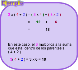 Propiedad distributiva de la multiplicación con respecto a la adición: para multiplicar un número por una suma de varios términos, multiplicamos el número por cada uno de los sumandos