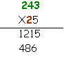 3) Luego se multiplica 2 por 243, es decir la decena del multiplicador; por cada uno de los números del multiplicando. El resultado se coloca debajo del 1215, pero cuidando de que coloquemos la primera cifra debajo de la decena. |