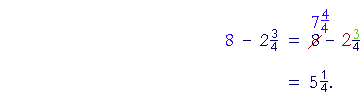 To subtract 3-fourths from 8, we must make fourths. To do this,