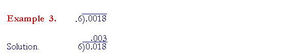 Multiply the divisor by 100 so that it becomes the whole number 3. Compensate by multiplying 12 by 100 also; add on two 0's. (Lesson 3, Question 1.) Make .008 into the whole number 8 by multiplying it by 1000. Multiply the dividend also by 1000: Move the decimal point three places right. (Lesson 3, Question 2.) Notice that the dividend becomes a whole number. There is no decimal point. Therefore there will be no decimal point in the quotient:
