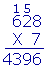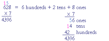 7 has been distributed to each unit of 628: to 6 hundreds + 2 tens + 8 ones. On the left (but compare the right): 7 × 8 ones = 56 ones, or simply 56. Write 6 below the line and carry the 5 onto the tens column, because the 5 is 5 tens. Next: 7 × 2 tens = 14 tens, plus 5 are 19 tens. Write 9 and carry the 1 onto the hundreds column -- because 19 tens = 190. The carried 1 is 1 hundred. Finally: 7 × 6 hundreds = 42 hundreds, plus 1 is 43 hundreds. Write 43. When the multiplier has more than one digit --