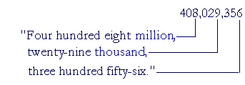 As for "and," in speech it is common to say "Six hundred and nine," but in writing we should reserve "and" for the decimal point, as we will see in the next Lesson. (For example, we should write $609.50 as "Six hundred nine dollars and fifty cents." Not "Six hundred and nine dollars.") Example 4. Write in numerals: Four hundred eight million, twenty-nine thousand, three hundred fifty-six. Answer. Pick out the classes: "million", "thousand". Each class (except perhaps the first class on the left) has exactly three digits:
