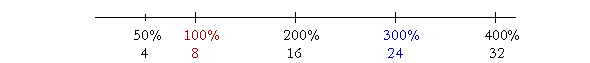 Example 7. What ratio has 200 to 100? Answer. 200 is two times 100, or twice as much as 100. 200%, then, means twice as much. 200% of 6 -- two times 6 -- is 12. Example 8. How much is 300% of 8? Answer. 24. 300% of 8 means three times 8, because 300 is three times 100.