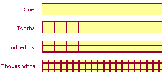 If each Tenth is divided into ten equal pieces, then each thin rectangle will be a hundredth part of One. If each Hundredth is divided into ten equal pieces, then each tiny piece will be a thousandth part of One. And so on. These are called the decimal units. |
