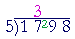 Write 3 over the 7 (not over the 1), and write the remainder 2 next to the 9. Continue: "5 goes into 29 five (5) times (25) with 4 left over.