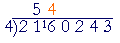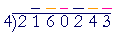 We will write a digit over the 1, then over the 6, then over the 0, and so on, until finally we write a digit over the 3. Begin, "4 goes into 21 five (5) times (20) with remainder 1 ."