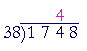 38 will not go into 1; and it will not go into 17; but it will go into 174. The question is, How many times? To answer, Try the first digit of the divisor, 3, into the first two digits of the dividend, 17.