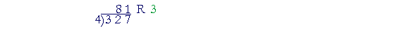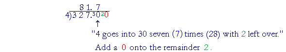 Begin, "4 goes into 32 eight (8) times. "4 goes into 7 one (1) time with 3 left over. There are no more digits in the dividend. Therefore, according to the rule: Place a decimal point, bring it up to the quotient, and add a 0 onto the remainder 3: Continue dividing. Place a 0 after each remainder: The quotient of 327 ÷ 4, then, may be expressed in three different ways: