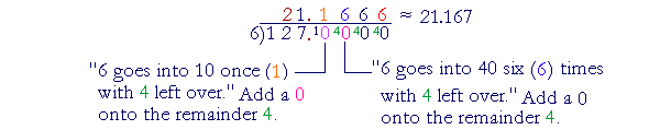 Now the same remainder 4 will be repeated. This division will never be exact. To round off to three decimal places, then, we must know the digit in the fourth place -- 6. Therefore, we add 1 to the previous digit; we get 21.167 To round off, we must know one more decimal place Example 8. The dividend less than the divisor. 5 ÷ 8 The dividend 5 is less than the divisor 8. In this case, proceed in this same way. 8 is the divisor. Write 8 outside the division box: "8 goes into 5 zero (0)." Place the decimal point, and add on a 0. Next, "8 goes into 50 six (6) times (48) with 2 left over." "8 goes into 20 two (2) times (16) with 4 left over." "8 goes into 40 five (5) times exactly." We will see the actual application of the dividend less than the divisor when we come to changing a fraction to a decimal (Lesson 23). For,