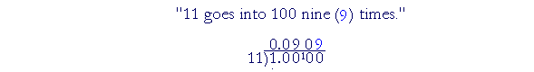 The horizontal line separating 5 and 8 is the division bar. Example 9. The following division will not be exact. Round it off to three decimal places: 1 ÷ 11 Solution. Place 11 outside the box and begin: "11 goes into 1 zero (0)." Place the decimal point, and add on a 0. Now 11 does not go into 10. Write 0 in the quotient -- -- and add another 0 onto the dividend. "11 goes into 100 nine (9) times, with 1 left over." Write 9 in the quotient, and add a 0 onto the remainder 1.