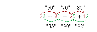 "170 + 11 = 181" Example 6. 23 + 32 + 25 + 12 Add up all the tens, then add on the ones. Say each partial sum. Say