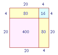 Then the area of that square will be 24 × 24. But we can break up 24 into 20 + 4. Therefore the entire square will be composed of the following: