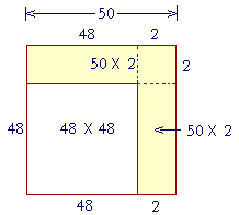 The entire square is the square of 50. It is composed of the square of 48, plus two rectangles, 50 × 2 -- which we must subtract. But we should not subtract the square of 2 twice. Therefore we add it at the end.