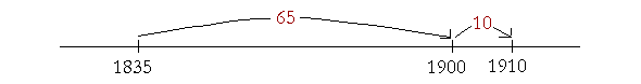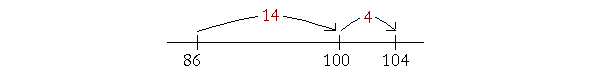 86 + 14 will bring us to 100. Plus 4 is 104. Thus the distance between 86 and 104 is 14 + 4 = 18. Example 4. Mark Twain was born in 1835 and died in 1910. How old was he when he died? Answer. Jump first to the century mark. Say, "1835 plus 65 is 1900, plus 10 is 1910. He was 75." (65 + 10)