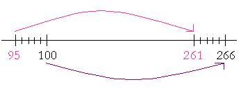 If we add 5 -- or any number -- to both 95 and 261, the distance between them does not change. Therefore, 261 − 95 = 266 − 100 = 166. |