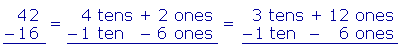 | When a digit in the bottom number is larger, decompose 1 unit of higher value into 10 units of the next lower value, and regroup. | |