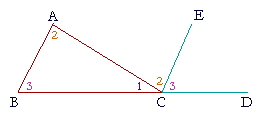 For, on extending BC to D, and drawing CE parallel to AB, the angles BAC, ACE labeled 2 are alternate angles; angle 3 on the right is exterior to the parallel lines and is equal to the interior angle 3. Angles 1, 2, 3 along BD form a straight angle composed of two right angles. And they are equal to angles 1, 2, 3 of the triangle!