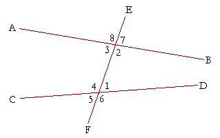 We call angles 1, 2, 3, 4 the interior angles, while angles 5, 6, 7, 8 are the exterior.