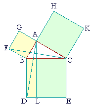 Now it is also a theorem that if BC is the diameter of a circle and A any point on the circumference, then angle BAC is always a right angle. (Proposition III. 31.) Therefore if we imagine the point A moving along the circumference, then at each point we will have a right angle. The square on BA will grow larger while the square on AC grows smaller, yet they continually adjust themselves so that together they equal the constant square on BC! That equality of areas is what makes Pythagoras's theorem so remarkable. Moreover, actually seeing that equality -- feeling it, almost -- rather than just proving it, is the essence of geometry. For however easy or difficult it might be to prove, actually seeing the fact -- that those areas really are equal -- remains elusive. Over the centuries therefore there have been many, many proofs of this famous theorem, each one offering a different insight. See Topic 3 of Trigonometry. The converse The hypothesis of Proposition 47 is that the triangle is right-angled; hence the converse, which is Proposition 48 and the last theorem of Book I, has for its conclusion that the triangle is right-angled. Here is the enunciation. PROPOSITION 48. THEOREM