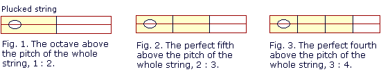 hear the interval called an octave when the length of a vibrating string is halved, that is to say, when the length of the plucked string is to the whole string in the ratio 1:2 (Fig 1). We hear the interval called a perfect fifth (G above C) when two thirds of a string is plucked (Fig. 2), that is, when the stopped string is to the whole string in the ratio 2:3. And we hear a perfect fourth (F above C) when three fourths of the string is sounded (Fig. 3); and so on, for each interval in the musical scale. In fact, Pythagoras taught that all things are known through number (not symbols for numbers). Or rather, "All things are assimilated to number." This means that just as one population becomes assimilated by another -- they become just like those others -- so all things are like numbers. In that likeness, all things meet and are intelligible.