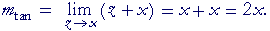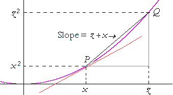 We found the slope of the secant PQ to be z + x . To find the slope of the tangent at P, we will take the limit as z approaches x.