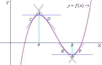 Now, what characterizes the graph at an extreme value?  The tangent to the curve is horizontal.  We see this at the points A and B above.  The slope of each tangent line -- the derivative when evaluated at a or b --