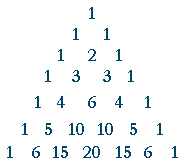 This triangular array is called Pascal's Triangle. Each row gives the binomial coefficients. That is, the row 1 2 1 are the coefficients of (a + b)². The next row, 1 3 3 1, are the coefficients of (a + b)3; and so on. To construct the triangle, write 1, and below it write 1 1. Begin and end each successive row with 1. To construct the intervening numbers, add the two numbers immediately above. Thus to construct the third row, begin it with 1, then add the two numbers immediately above: 1 + 1. Write 2. Finish the row with 1. To construct the next row, begin it with 1, and add the two numbers immediately above: 1 + 2. Write 3. Again, add the two numbers immediately above: 2 + 1 = 3. Finish the row with 1. Example 8. Expand (x − 1)6. Solution. According to Pascal's triangle, the coefficients are 1 6 15 20 15 6 1. In the binomial, x is "a", and −1 is "b". The signs will alternate: