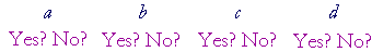 To a, then, there will be 2 possibilities.  After that has happened, b will have one of those 2 assignments.  After that, so will c, and after that so will d.  The total number of possible assignments of Yes or No, then, is