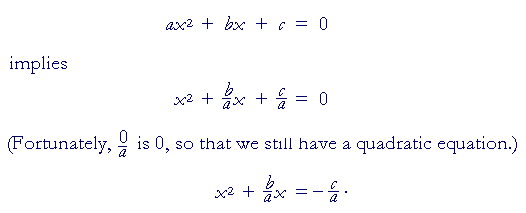 To prove this, we will complete the square. But to do that, the coefficient of x² must be 1. Therefore, we will divide both sides of the original equation by a: