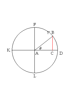 The line value of cos θ is AC. As the point B revolves, C shuttles back and forth along the diameter DK. At 0°, AC coincides with the unit radius AD, so that cos 0° = 1.