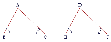 Let ABC, DEF be two triangles in which angles B and C are equal respectively to angles E and F; The proof is not really difficult but it involves two cases; this one for when the adjoining sides BC, EF are equal, and another for when the sides opposite equal angles are equal: sides AB, DE; hence the proof is lengthy. Each case is proved by the indirect method, and rests ultimately on S.A.S. Here is the case in which the sides adjoining the equal angles are equal. We want to show that the two triangles are equal in all respects.