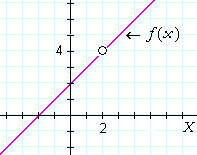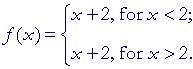 Example 2. Consider the function f(x) = x + 2, whose graph is a simple straight line. And just to be perverse (and to illustrate a logical point to which we shall return in Lesson 3), let f(x) not exist when x = 2. That is, let