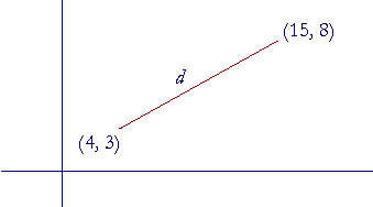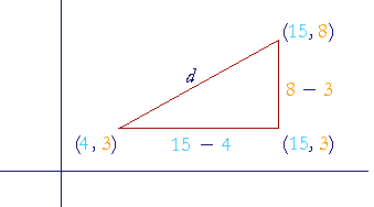 Consider the distance d as the hypotenuse of a right triangle. Then according to Lesson 31, Problem 5, the coordinates at the right angle are (15, 3). Therefore, the vertical leg of that triangle is simply the distance from 3 to 8: 8 − 3 = 5.