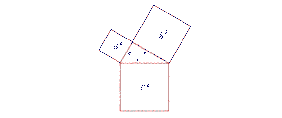 This means that if ABC is a right triangle with the right angle at A, then the square drawn on BC opposite the right angle, is equal to the two squares together on CA, AB. In other words, if it takes one can of paint to paint the square on BC, then it will also take exactly one can to paint the other two squares. The side opposite the right angle is called the hypotenuse ("hy-POT'n-yoos"; which literally means stretching under). Algebraically, if the hypotenuse is c, and the sides are a, b: