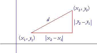 The sub-script 1 labels the coordinates of the first point; the sub-script 2 labels the coordinates of the second. (We write the absolute value, because distance is never negative.) Here then is the Pythagorean distance formula between any two points: