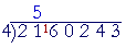 Next, we must write a digit over the 2:  "4 goes into 2 zero (0)."