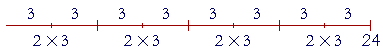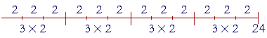 We now want to divide this by 3. We want to count the 3's in this figure. Now each group of Three 2's is a threesome -- it is a 3. And there are as many of those 3's in the bottom figure as there are (2 × 3)'s in the top figure. Count them! 24 ÷ (2 × 3) [The top figure] = (24 ÷ 2) ÷ 3 [The bottom figure].